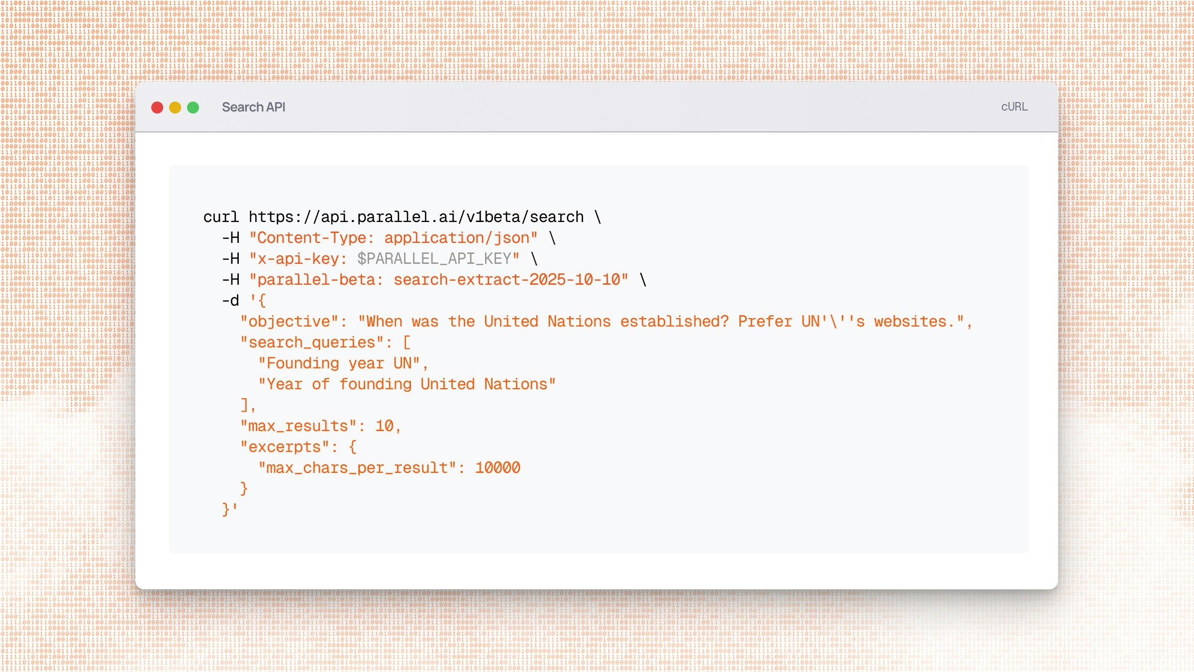The Parallel Search API is now available in beta - providing a tool for AI agents to search, rank, and extract information from the public web. Built on Parallel’s custom web crawler and index, the Search API takes flexible inputs (search objective and/or search queries) and returns LLM-ready ranked URLs with extended webpage excerpts. Learn more in our latest blog.Bugs (1)