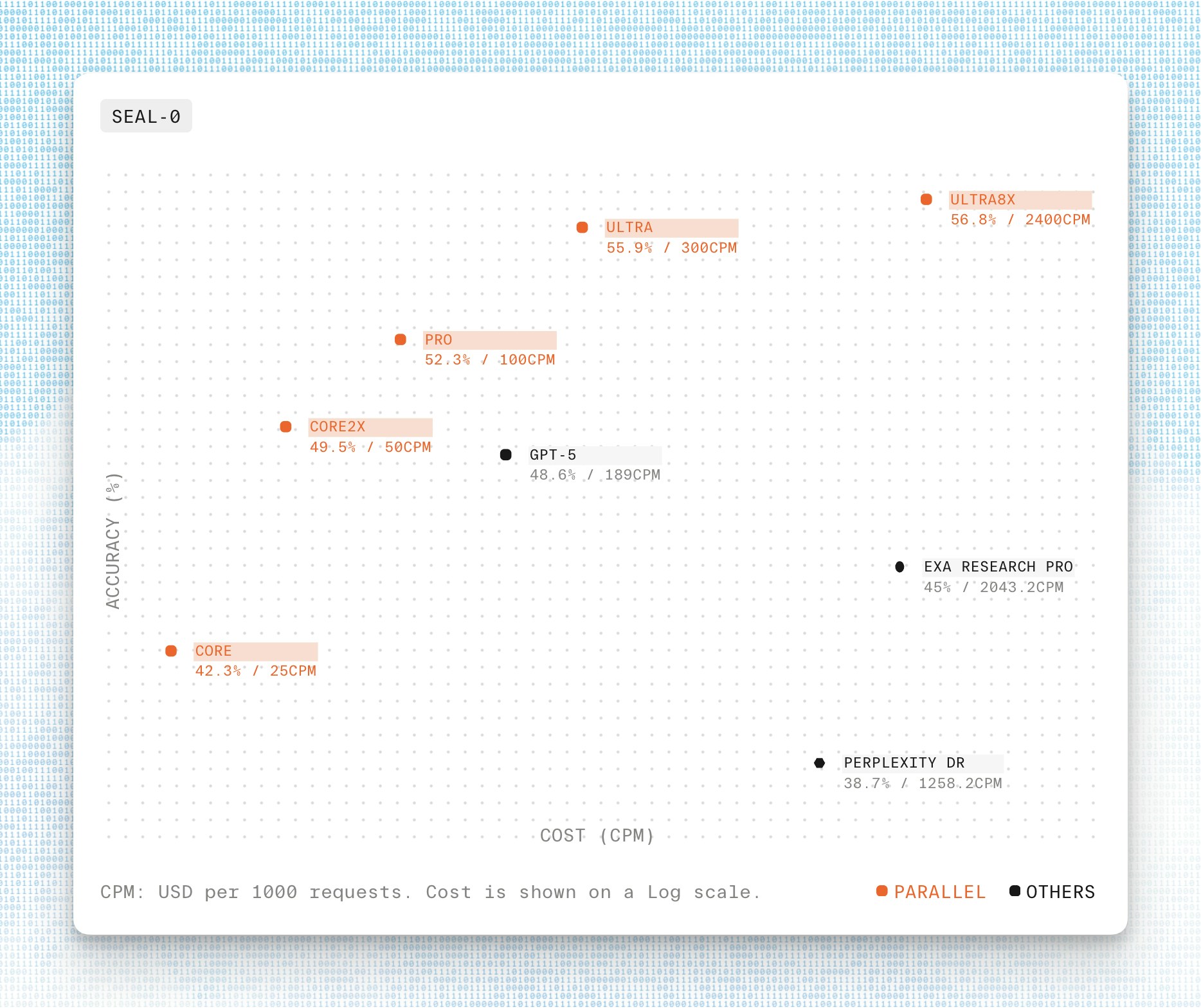 Today, we’re announcing that Parallel is the only AI system to outperform both humans and leading AI models like GPT-5 on the most rigorous benchmarks for deep web research. Our APIs are now broadly available, bringing production-grade web intelligence to any AI agent, application, or workflow. Learn more in our latest blog.