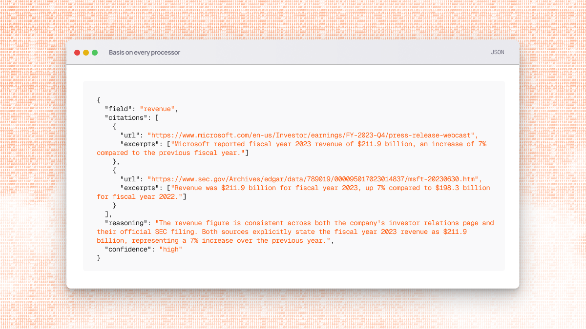 All Task API processors now provide complete basis verification with Citations, Reasoning, Confidence scores, and Excerpts. Previously,lite and base processors only included Citations and Reasoning, while core and higher tiers provided the full feature set. This enhancement enables comprehensive verification and transparency across all processor tiers, making it easier to validate research quality regardless of which processor you choose.