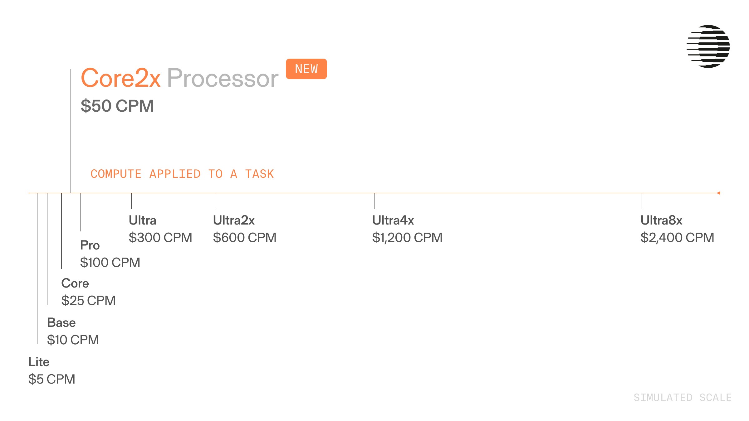When running Tasks with Parallel, choose between 5 processors -lite, base, core, pro, and ultra. We’ve built distinct processor options so that you can optimize price, latency, and quality per task.Self-Serve Developer Platform