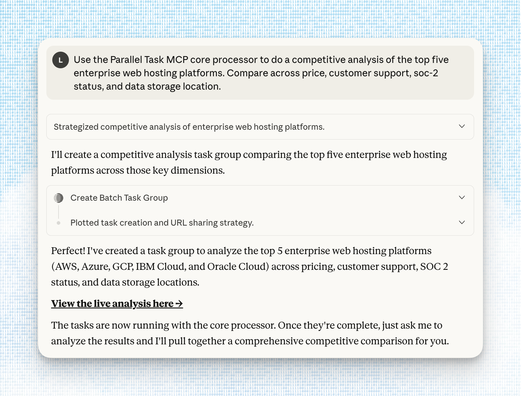 The Task MCP Server uses a first-of-its-kind async architecture that lets agents start research tasks and continue executing other work without blocking. This is critical for production agents handling complex workflows— start a deep research task on competitor analysis, move on to enriching a prospect list, then retrieve the research results when complete.