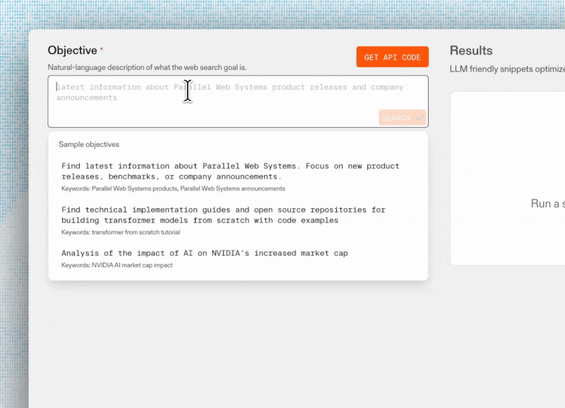 The Parallel Search API, built on our proprietary web index, is now generally available. It’s the only web search tool designed from the ground up for AI agents: engineered to deliver the most relevant, token-efficient web data at the lowest cost. The result is more accurate answers, fewer round-trips, and lower costs for every agent.