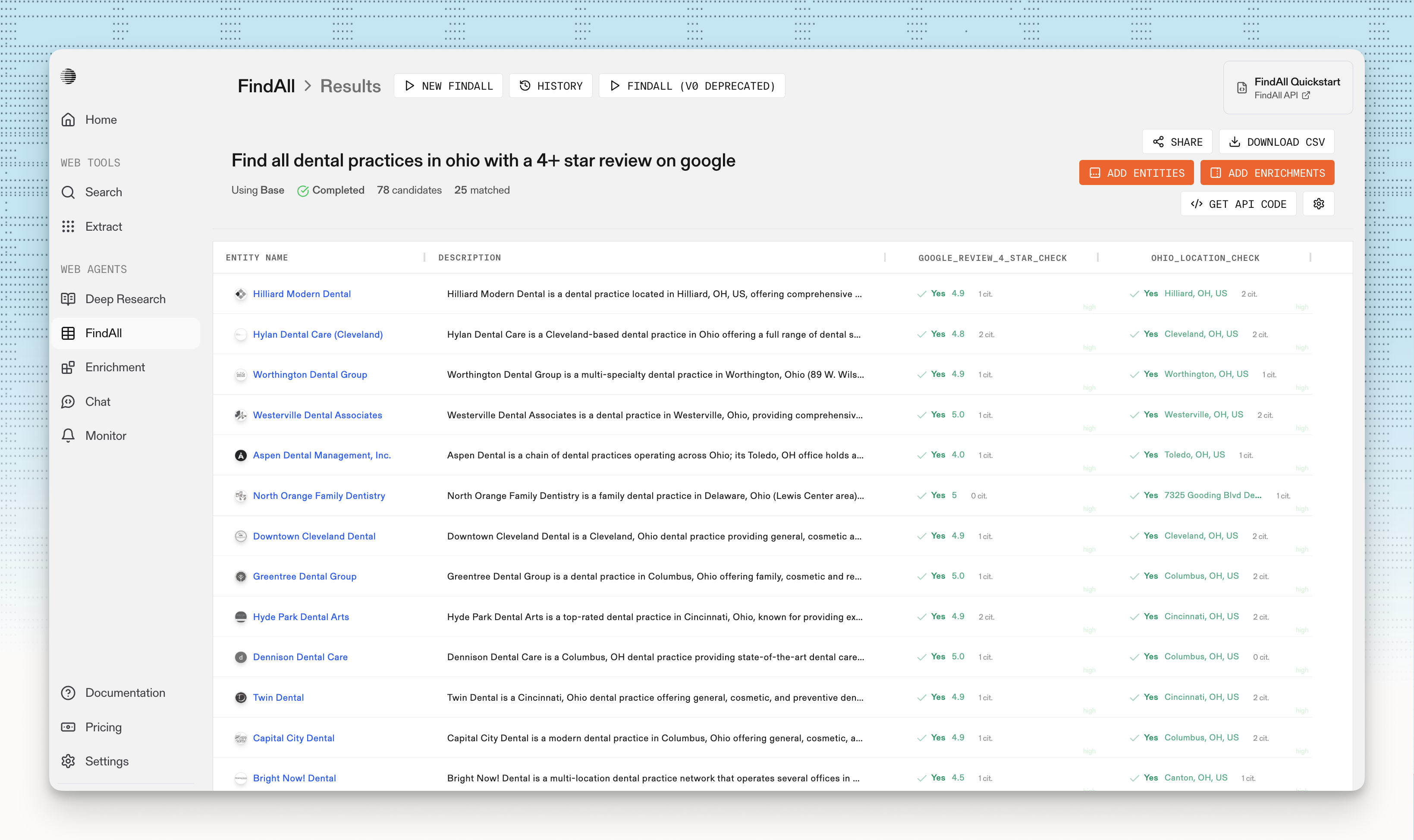 Parallel FindAll is now available in beta. Use it to create custom datasets from the web using natural language queries.
