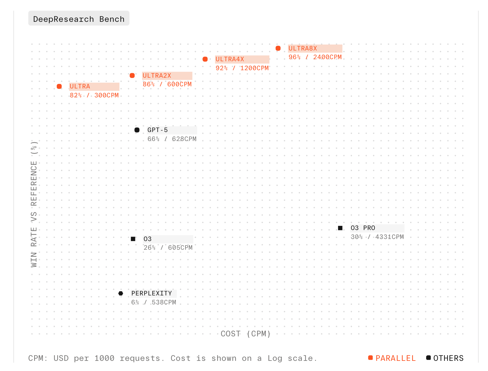 - Parallel Ultra achieves an 82% win rate against reference compared to GPT-5 at 66%, while being half the cost